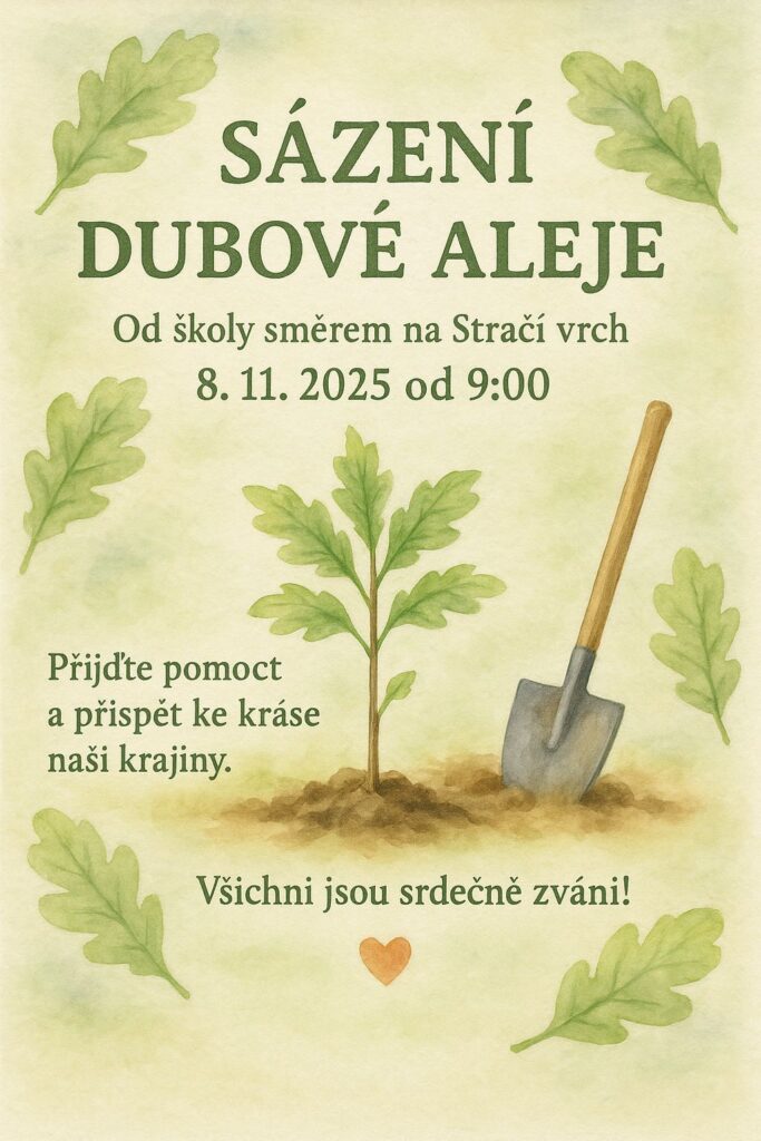 V sobotu 8. listopadu budeme spolu s Okrašlovacím spolkem vysazovat alej dubů, od nadějkovské školy směrem ke Stračímu vrchu.