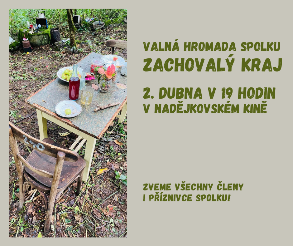 Na Zelený čtvrtek 2. dubna se od 19 hodin v nadějkovském kině koná valná hromada spolku Zachovalý kraj. Zveme všechny členy spolku i ty, kdo se o jeho činnosti chtějí dozvědět víc nebo ji jakkoli podpořit!